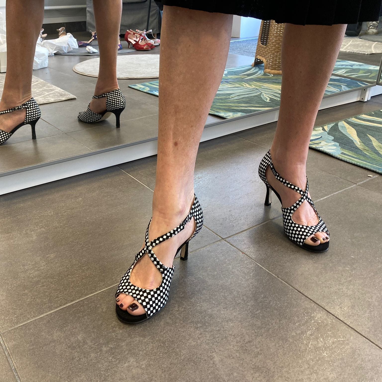 Cuir "daim" (veau velours) imprimé de petits carrés blancs vernis, effet carreaux noirs et blancs, liseré en cuir velours noir. Le talon et le bord de la semelle sont recouverts de cuir velours "daim" noir, ainsi que la partie interne de la semelle sur laquelle reposent les doigts de pieds (c'est tout doux !).